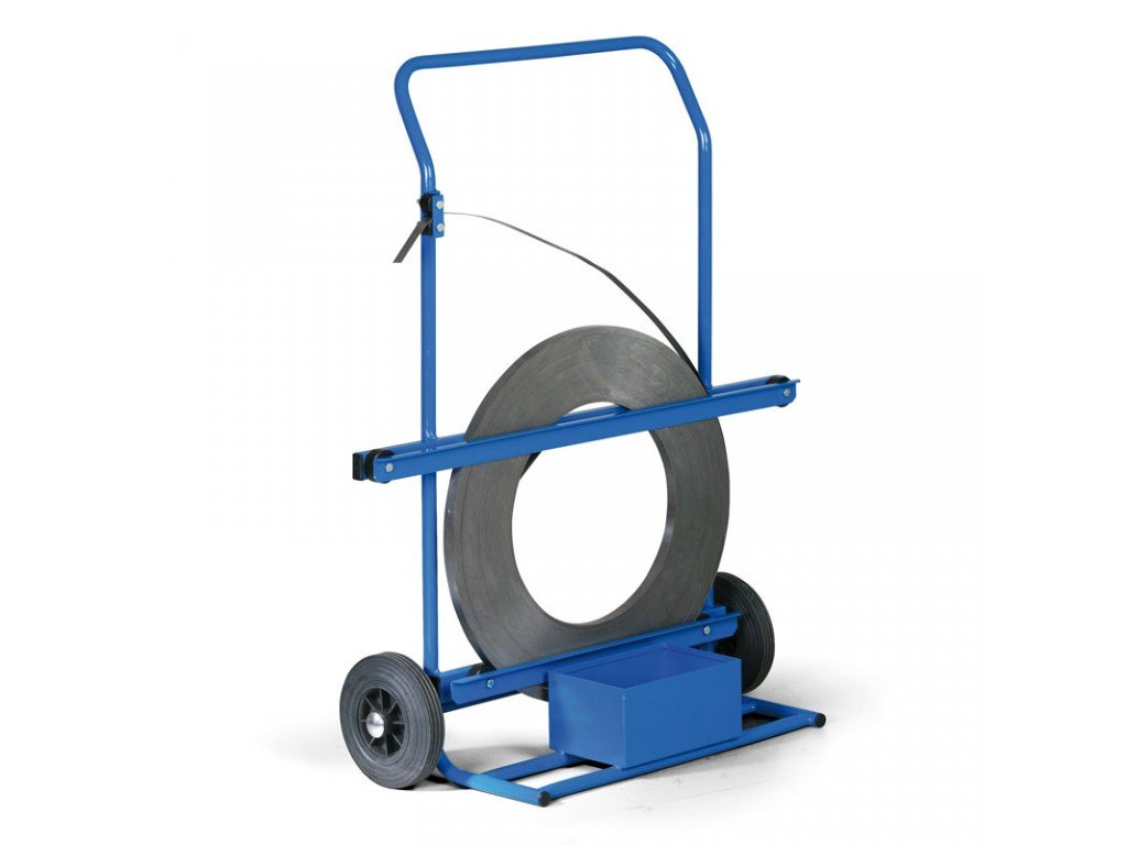 Pojízdný odvíječ pro ocelovou pásku. Snadno přemístitelný. Odvíjení ocelové pásky po ložiscích. Standardně pro šířku pásky do 20 mm. Plechová krabice pro spony a páskovačku. Lze použít do průměru 680 mm kotouče kovové pásky. Lakováno práškovým vypalovacím lakem v odstínu RAL5005 - modrá.