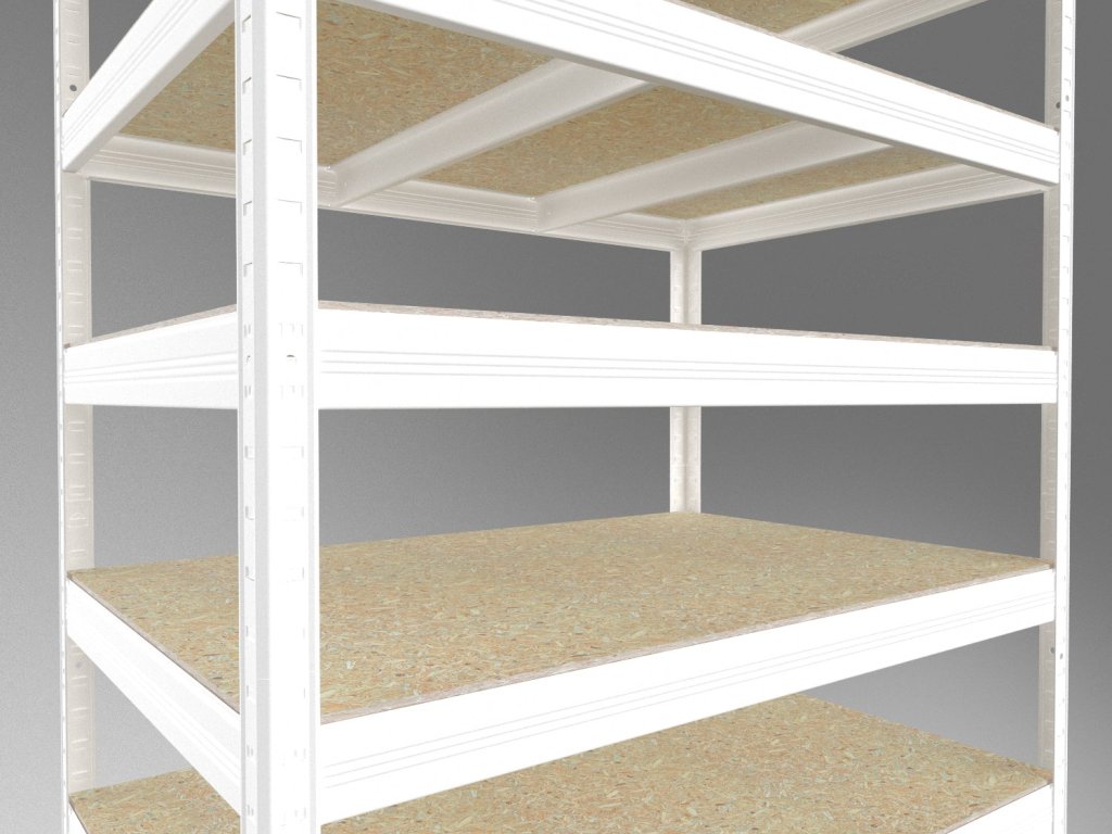 Bezšroubový regál s policemi z dřevotřísky OSB 10 mm. Regály s OSB policemi jsou vhodné i do vlhkých prostor jako například přístřešky, pergoly či sklepy. Nejsou však určeny do exteriéru s přímým působením srážek. Unikátní bezšroubový systém montáže umožňuje rychlé sestavení – nosníky stačí zasunout do stojin a zajistit lehkým poklepem. Pevné spojení bez šroubů zaručuje tuhost celé konstrukce.