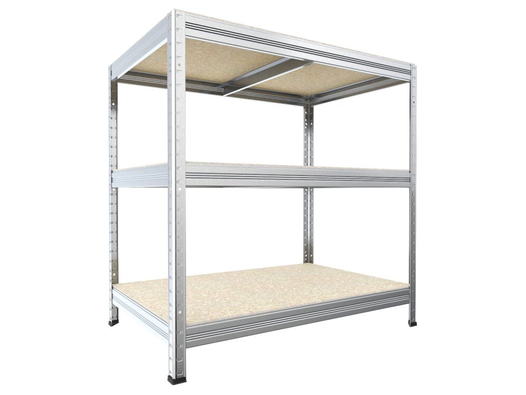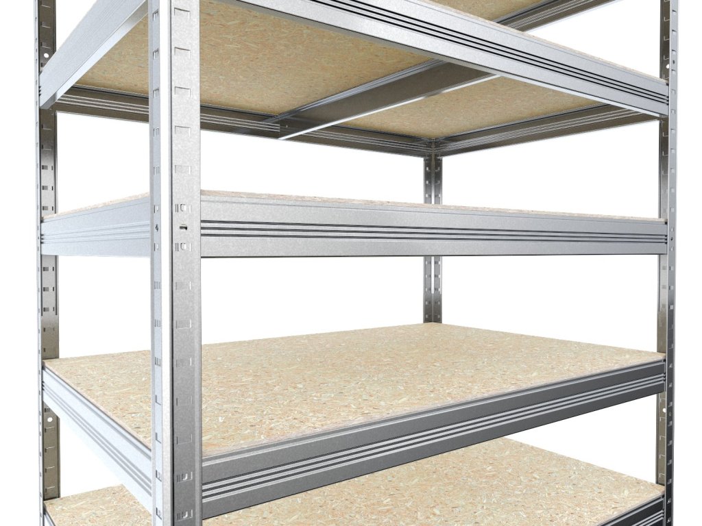 Bezšroubový regál s policemi z dřevotřísky OSB 10 mm. Regály s OSB policemi jsou vhodné i do vlhkých prostor jako například přístřešky, pergoly či sklepy. Nejsou však určeny do exteriéru s přímým působením srážek. Unikátní bezšroubový systém montáže umožňuje rychlé sestavení – nosníky stačí zasunout do stojin a zajistit lehkým poklepem. Pevné spojení bez šroubů zaručuje tuhost celé konstrukce.