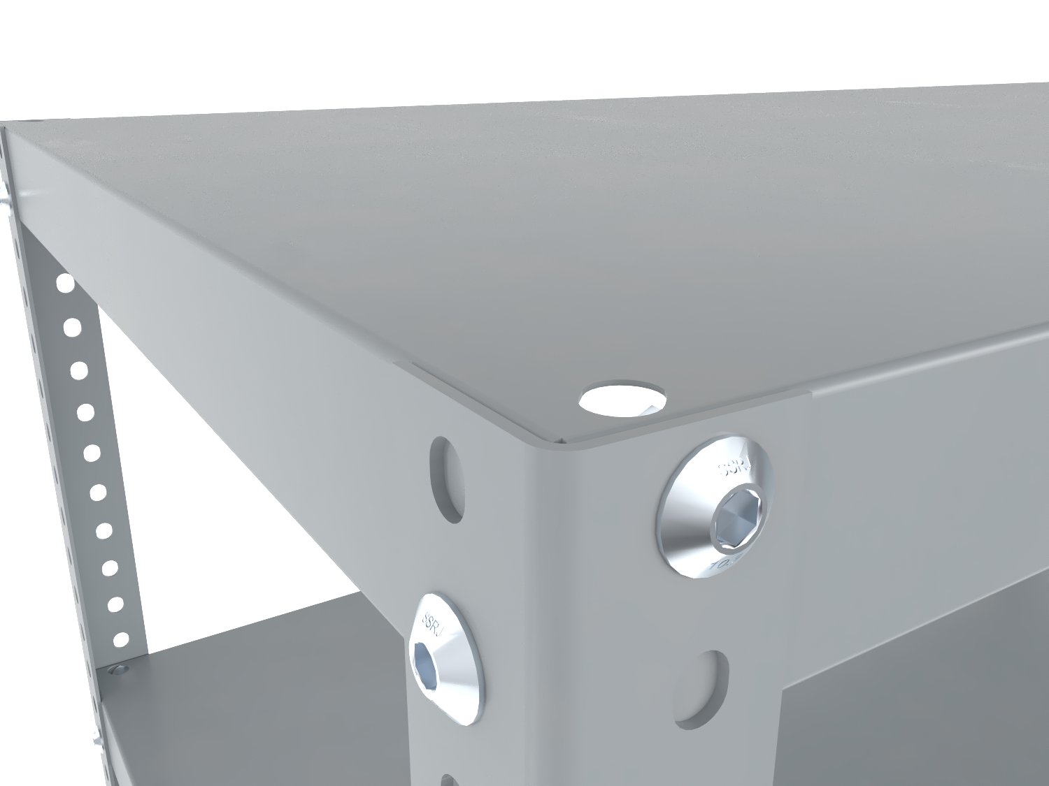 - Konstrukce z poctivé oceli – stabilita je zajištěna stojinami o tloušťce 2 mm a policemi o tloušťce 0,8 mm (vybrané typy zpevněny výztuhou s profilem trapézové vlny).