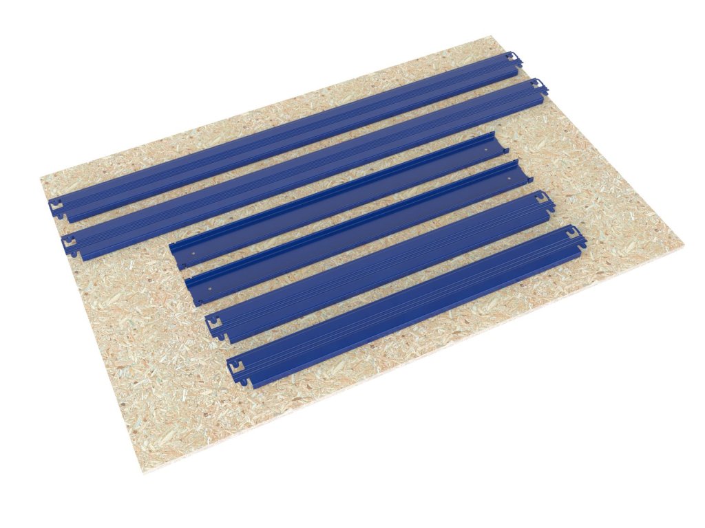 - Balení obsahuje jednu kompletní polici (patro), jak je vyobrazena na prvním obrázku nahoře v galerii: sadu nosníků, výztuhy a OSB polici 10 mm. Vše potřebné k montáži jedné police.