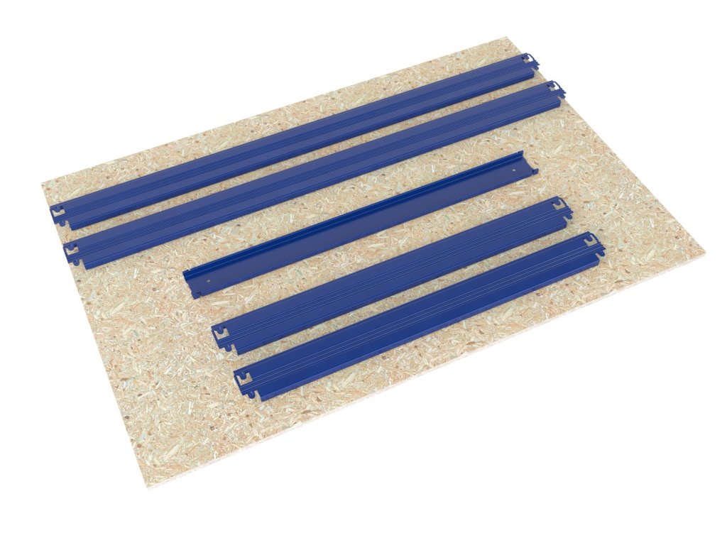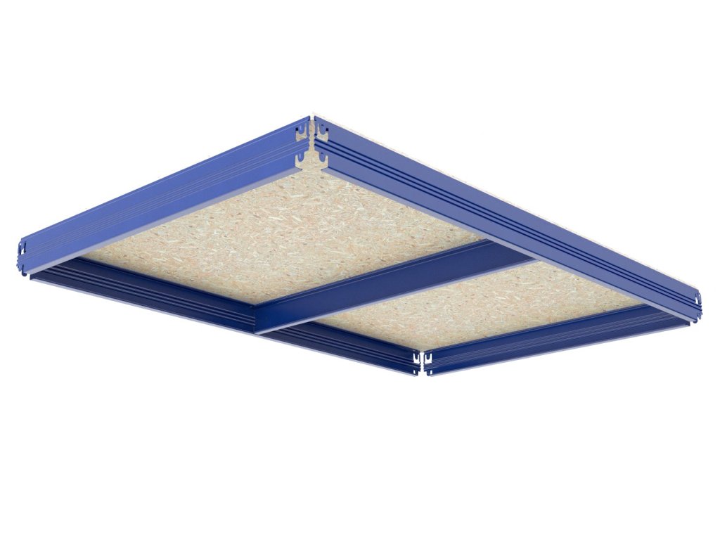 - Balení obsahuje jednu kompletní polici (patro), jak je vyobrazena na prvním obrázku nahoře v galerii: sadu nosníků, výztuhu a OSB polici 10 mm. Vše potřebné k montáži jedné police.