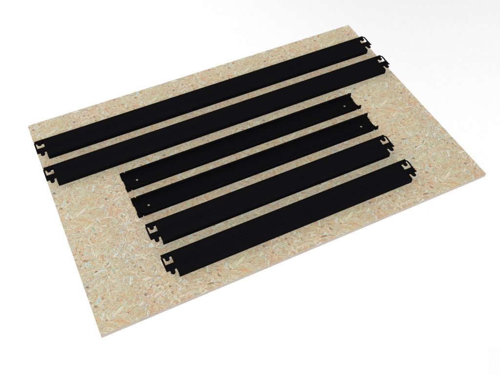 - Balení obsahuje jednu kompletní polici (patro), jak je vyobrazena na prvním obrázku nahoře v galerii: sadu nosníků, výztuhy a OSB polici 10 mm. Vše potřebné k montáži jedné police.