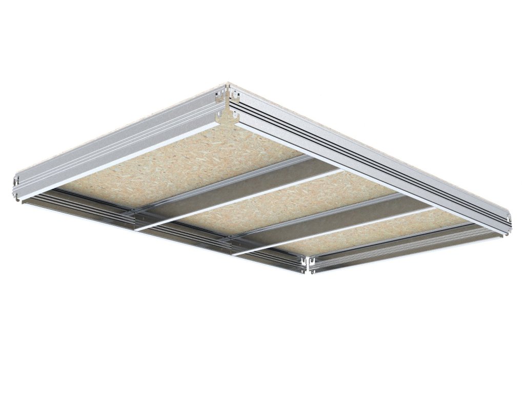 - Výška patra včetně OSB 10 mm je 62 mm (police přesahuje horní hranu nosníků o 5 mm)