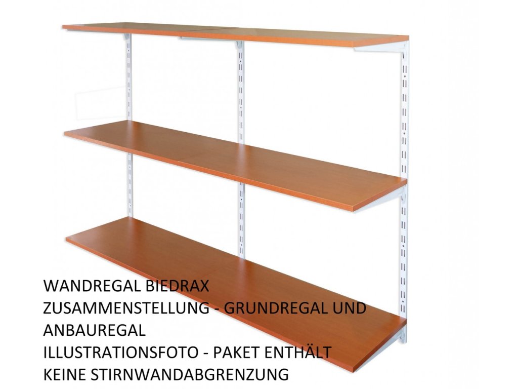 - Obsah balení přídavný regál: 1 kovová nástěnná lišta , kovové nosníky pod polici, police dřevotříska lamino 18 mm, šroubky pro připevnění polic k nosníkům.