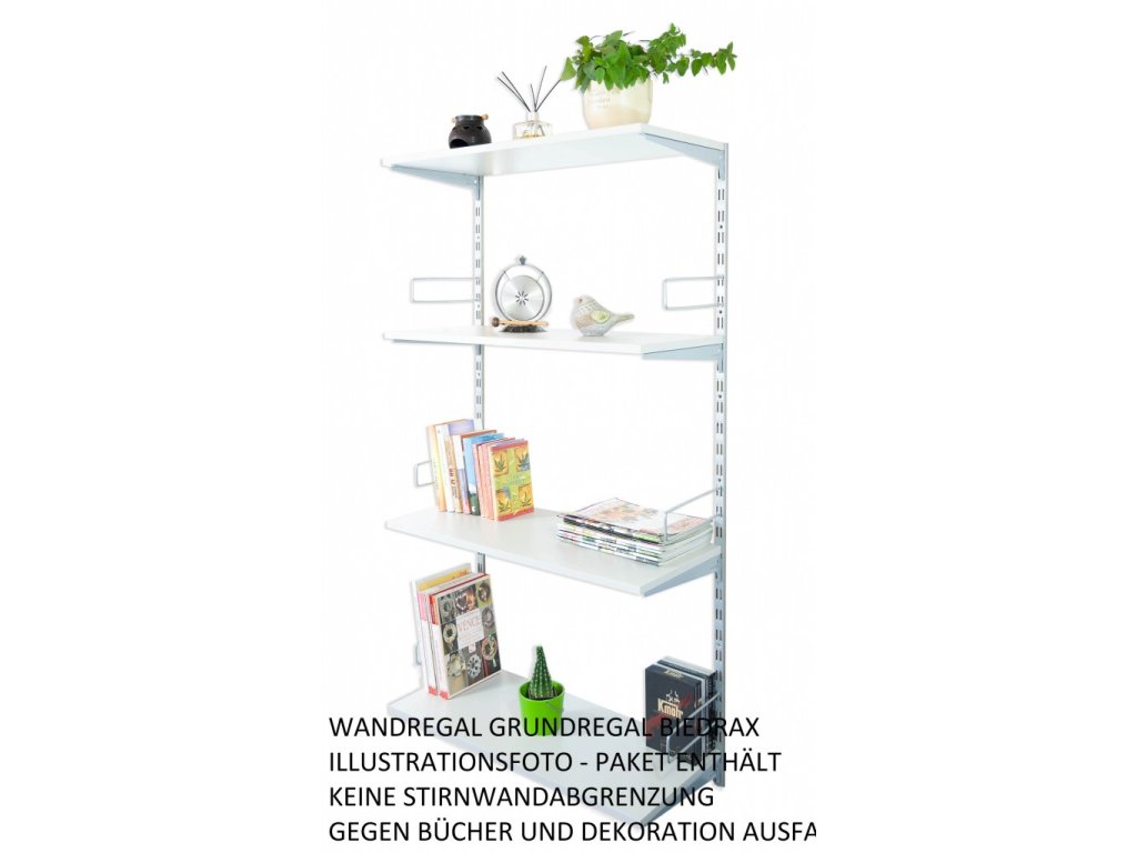 - Obsah balení základní regál: 2 kovové nástěnné lišty , kovové nosníky pod polici, police dřevotříska lamino 18 mm, šroubky pro připevnění polic k nosníkům.