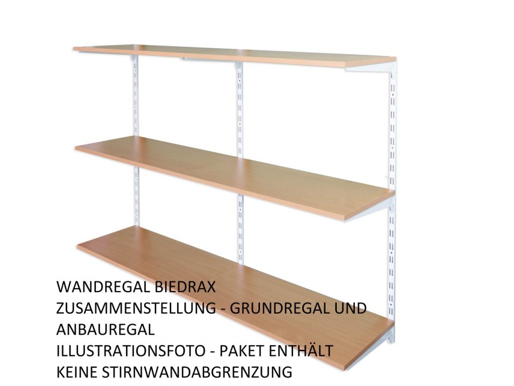 - Obsah balení přídavný regál: 1 kovová nástěnná lišta , kovové nosníky pod polici, police dřevotříska lamino 18 mm, šroubky pro připevnění polic k nosníkům.