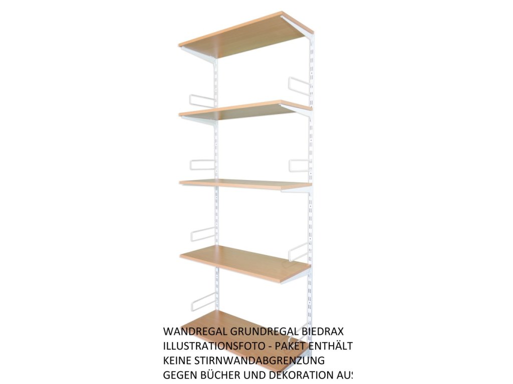 - Obsah balení přídavný regál: 1 kovová nástěnná lišta , kovové nosníky pod polici, police dřevotříska lamino 18 mm, šroubky pro připevnění polic k nosníkům.