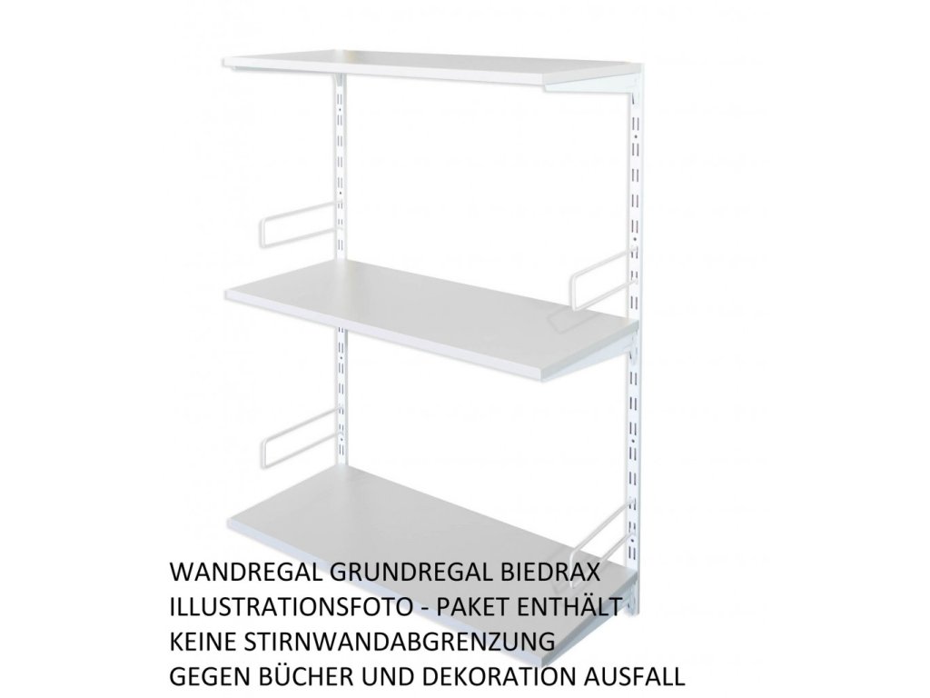- Obsah balení základní regál: 2 kovové nástěnné lišty , kovové nosníky pod polici, police dřevotříska lamino 18 mm, šroubky pro připevnění polic k nosníkům.