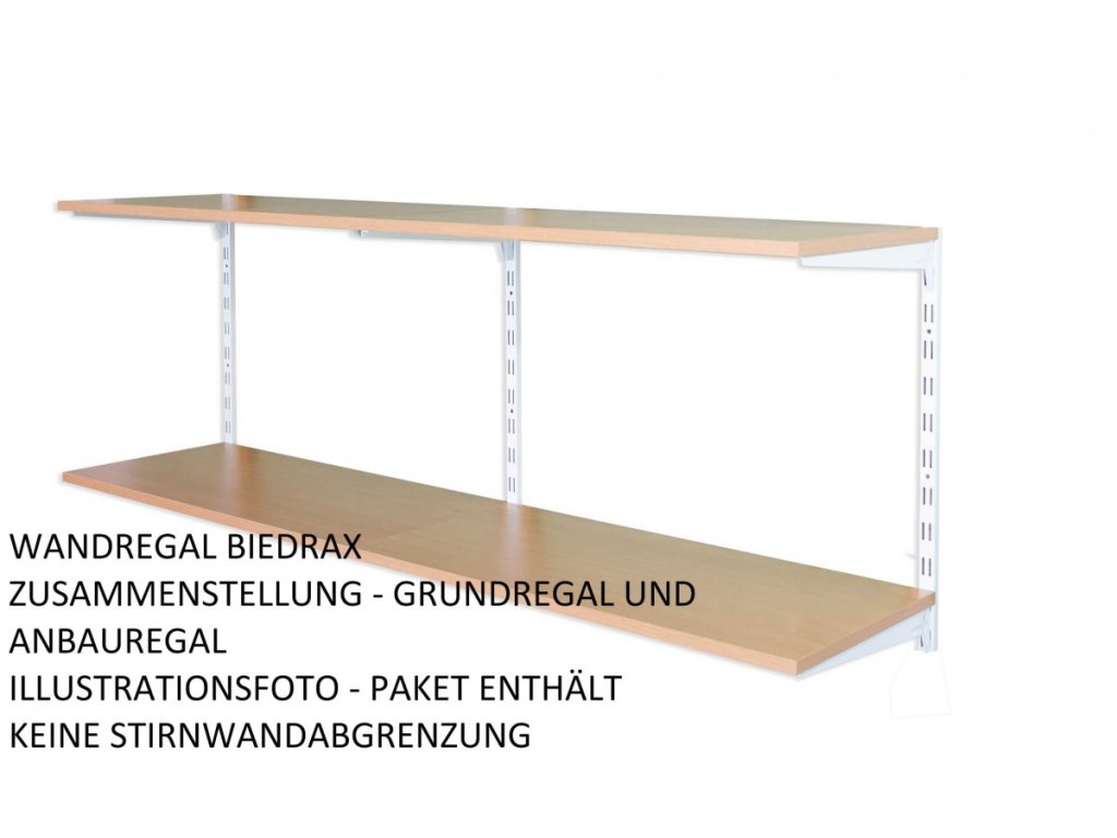 - Obsah balení přídavný regál: 1 kovová nástěnná lišta , kovové nosníky pod polici, police dřevotříska lamino 18 mm, šroubky pro připevnění polic k nosníkům.