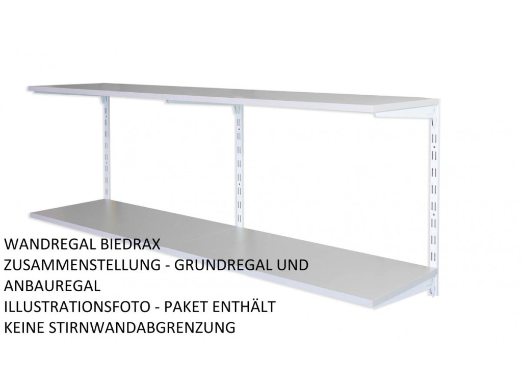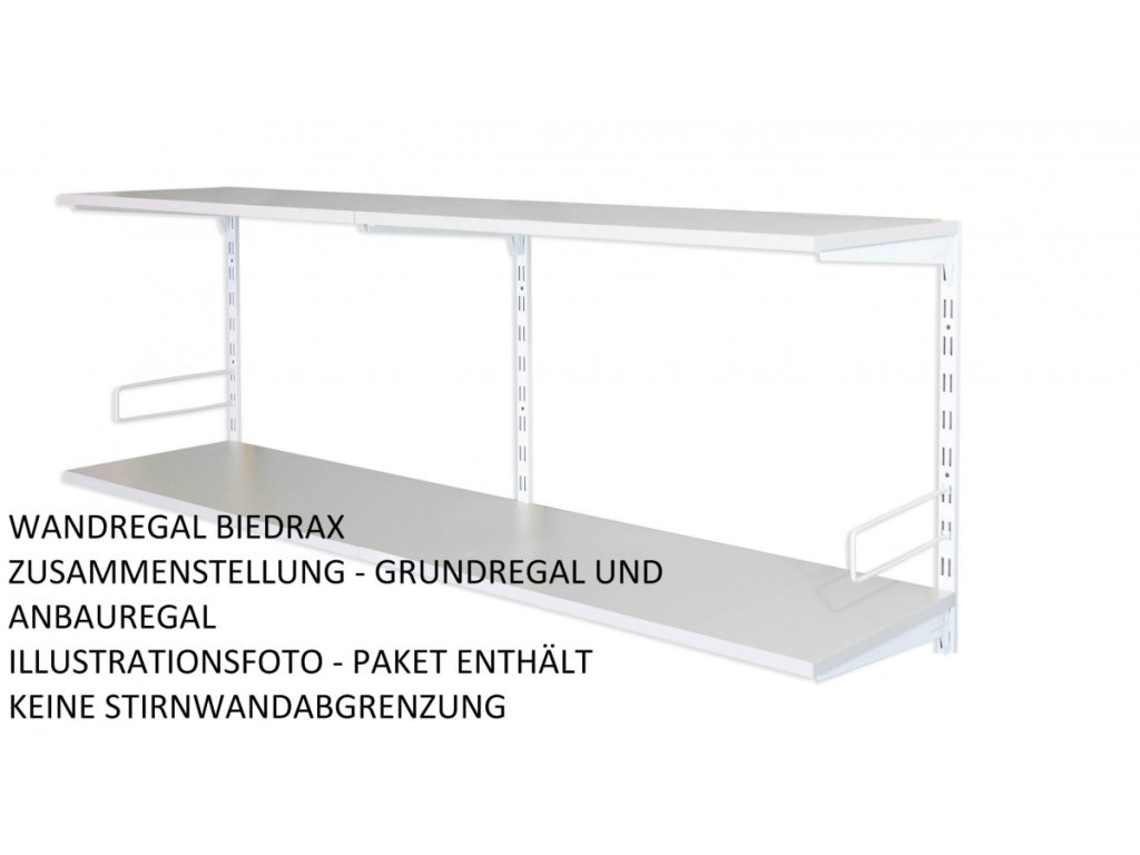 - Obsah balení přídavný regál: 1 kovová nástěnná lišta , kovové nosníky pod polici, police dřevotříska lamino 18 mm, šroubky pro připevnění polic k nosníkům.