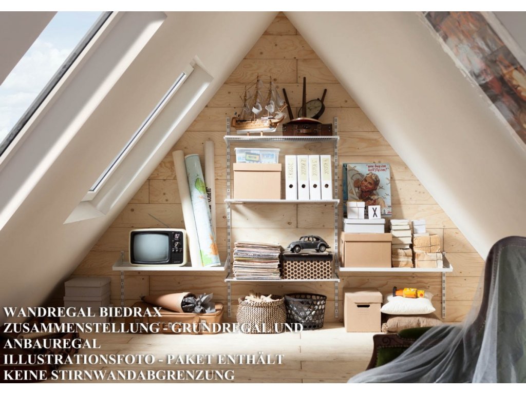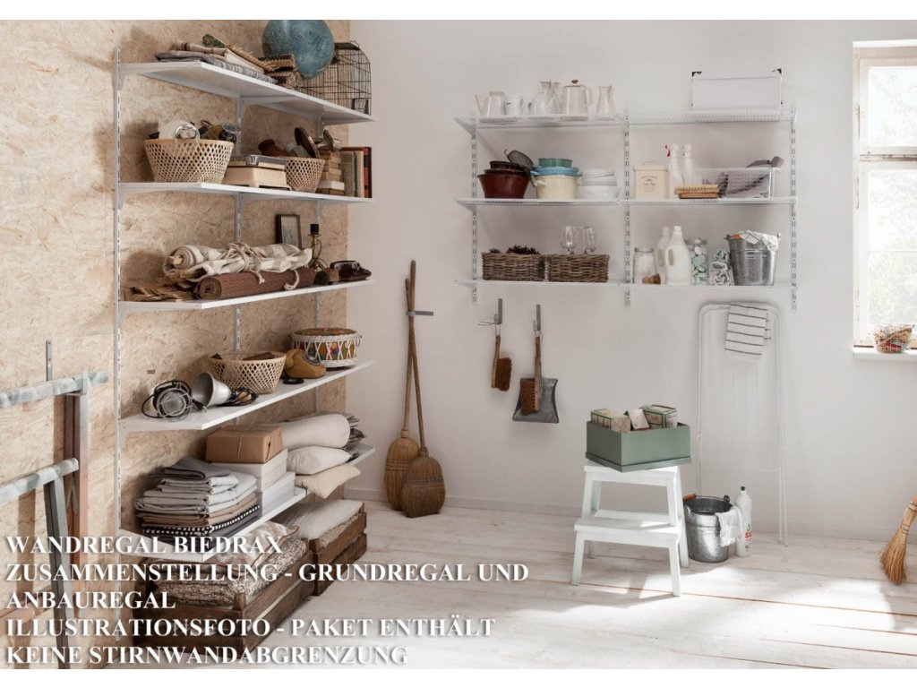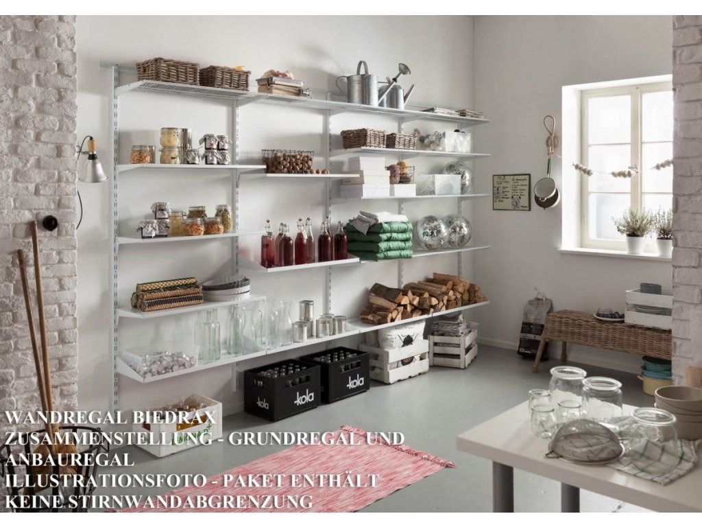 plechová police k nástěnnému regálu Biedrax - komplet s nosníky - kovová konstrukce lakovaná práškovou barvou. nástěnný regálový systém Biedrax je velmi univerzální regálový systém a lze jej použít kdekoliv v domácnosti. ať už jako nástěnný regál v komoře pro běžné domácí potřeby, nebo jako botník pro sezónní obuv. ve spíži jako regál pro zásoby, v dílně pro uskladnění nářadí nebo v garáži pro uskladnění všeho možného. vzhledem k vysoké kvalitě provedení lze náš nástěnný regálový systém využít i jako regály do šatny pro oblečení.