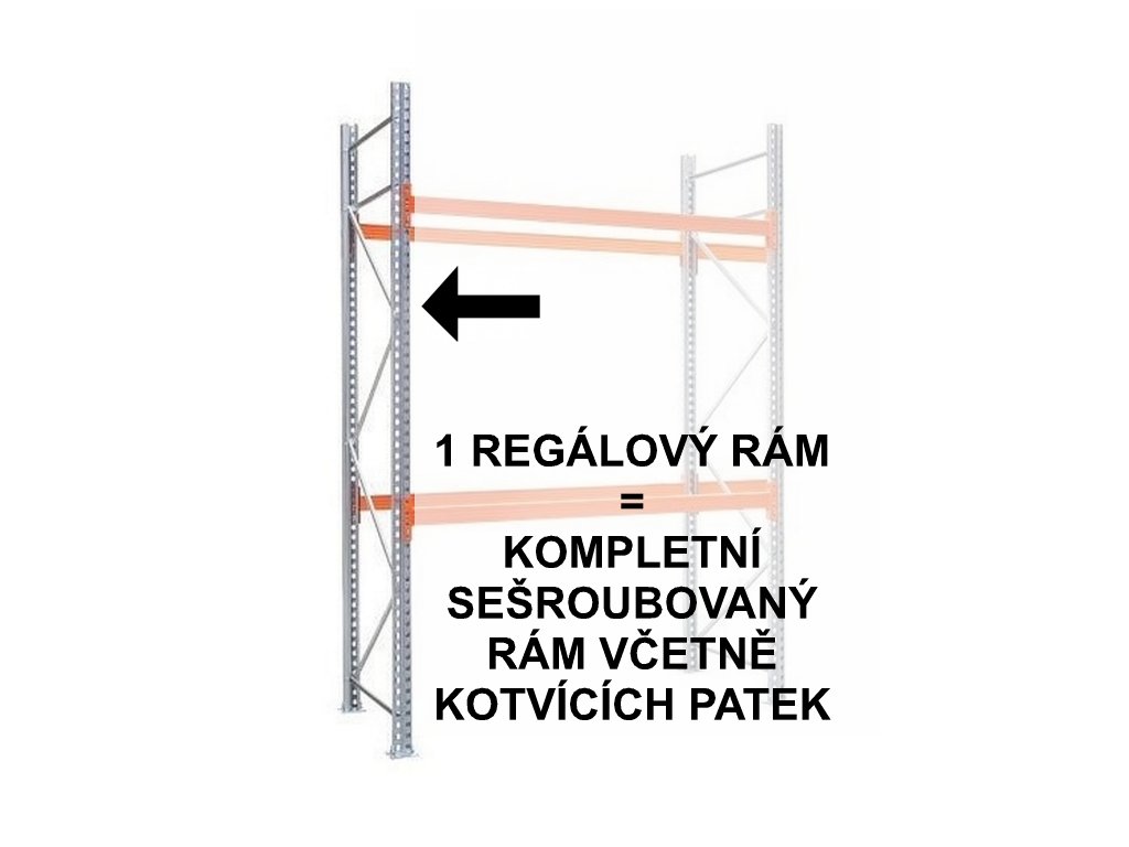 regálový rám k paletovým regálům tvoří dvě stojiny (svislé nohy) a příčky, vše je sešroubováno pevnostními šrouby. stojiny jsou na koncích opatřeny kovovými patkami, skrze tyto patky lze regál ukotvit k podlaze.