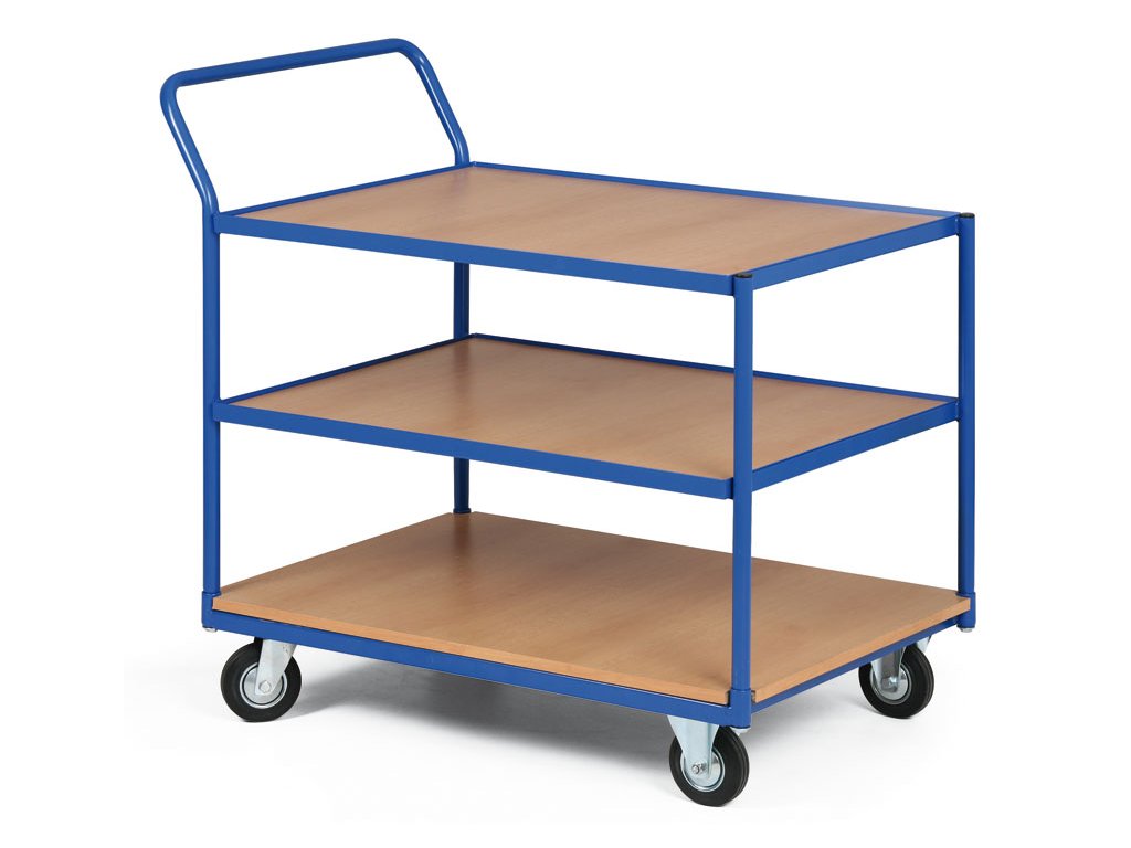 Dílenský policový vozík na přepravu zboží či materiálu. Konstrukce vozíku je svařena z ocelových profilů. Lakováno vypalovacím práškovým lakem v odstínu RAL 5005 - modrá. Police z dřevotřísky je uložena v ocelovém úhlovém profilu, který vytváři nízkou hranu. Rozměr police je 1000 x 700 mm. Kola jsou vybavena poklicí, která brání namotávání nití a provázků a také zanášení ložiska různými nečistotami, čímž se prodlužuje životnost kola. Kola o průměru 125 mm jsou 2 pevná a 2 otočná. Kola lze na objednávku doplnit o dvojčinnou brzdou proti pojezdu i proti otáčení kolem svislé osy.