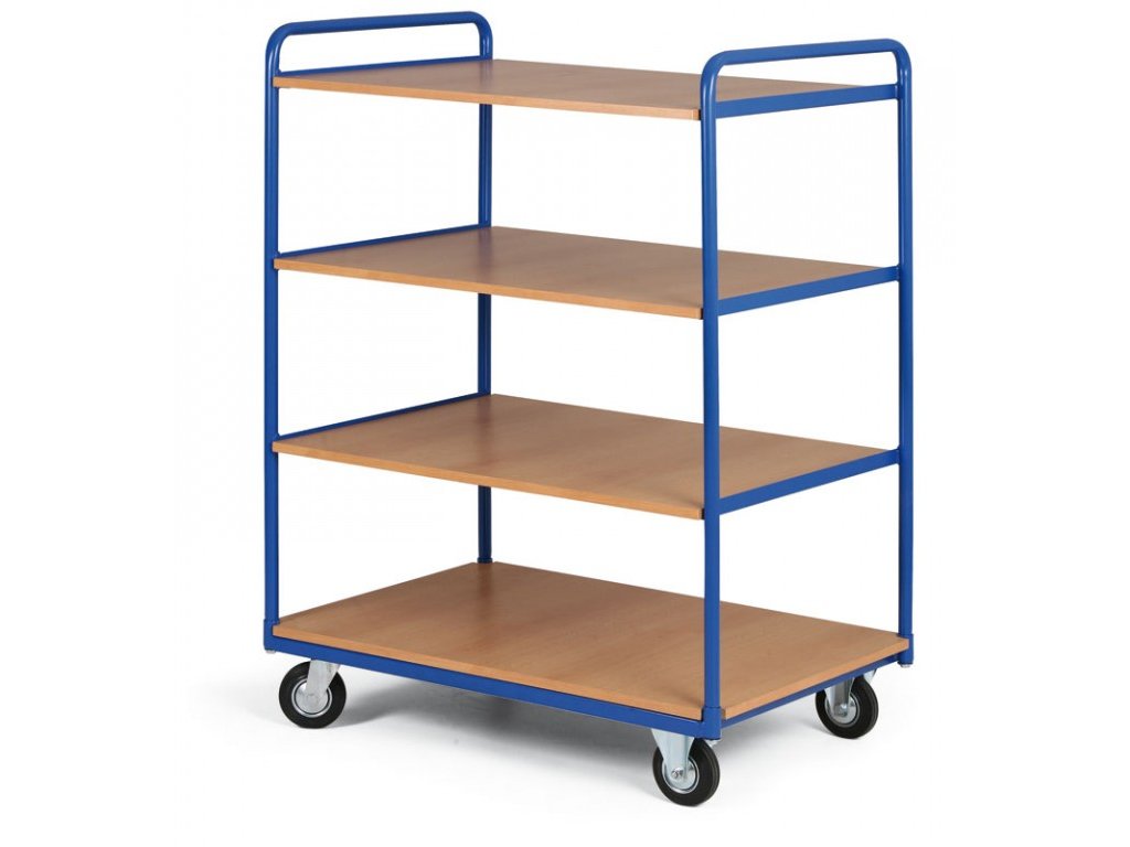 Dílenský policový vozík na přepravu zboží či materiálu. Konstrukce vozíku je svařena z ocelových profilů. Nosnost vozíku je 300 kg. Lakováno vypalovacím práškovým lakem v odstínu RAL 5005 - modrá. Police z dřevotřísky. Rozměr police je 1000 x 700 mm. Kola jsou vybavena poklicí, která brání namotávání nití a provázků a také zanášení ložiska různými nečistotami, čímž se prodlužuje životnost kola. Kola jsou o průměru 160 mm a 2 jsou pevná a 2 otočná podle vlastní osy. Kola lze na objednávku doplnit o dvojčinnou brzdou proti pojezdu i proti otáčení kolem svislé osy.