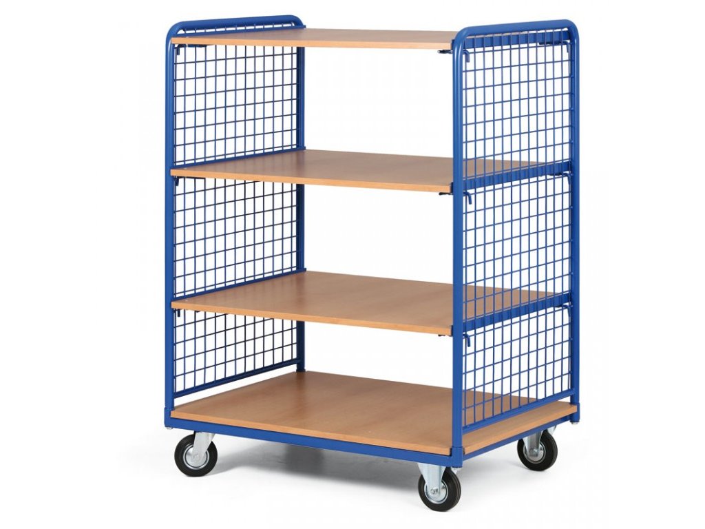 Dílenský policový vozík na přepravu zboží či materiálu. Konstrukce vozíku je svařena z ocelových profilů. Nosnost vozíku je 400 kg. Lakováno vypalovacím práškovým lakem v odstínu RAL 5005 - modrá. Police z dřevotřísky. Rozměr police je 1000 x 700 mm. Kola jsou vybavena poklicí, která brání namotávání nití a provázků a také zanášení ložiska různými nečistotami, čímž se prodlužuje životnost kola. Kola jsou o průměru 200 mm a 2 jsou pevná a 2 otočná podle vlastní osy. Kola lze na objednávku doplnit o dvojčinnou brzdou proti pojezdu i proti otáčení kolem svislé osy.