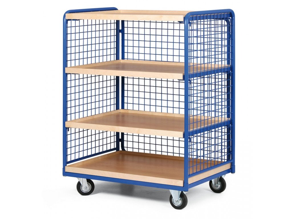 Dílenský policový vozík na přepravu zboží či materiálu. Konstrukce vozíku je svařena z ocelových profilů. Nosnost vozíku je 400 kg. Lakováno vypalovacím práškovým lakem v odstínu RAL 5005 - modrá. Police z dřevotřísky s hranou zabraňující vypadávání převáženého materiálu či zboží. Rozměr police je 1000 x 700 mm. Výplň madel a zadní stěny je síto. Kola jsou vybavena poklicí, která brání namotávání nití a provázků a také zanášení ložiska různými nečistotami, čímž se prodlužuje životnost kola. Kola jsou o průměru 200 mm a 2 jsou pevná a 2 otočná podle vlastní osy. Kola lze na objednávku doplnit o dvojčinnou brzdou proti pojezdu i proti otáčení kolem svislé osy.