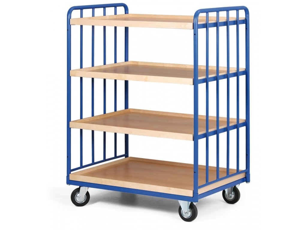 Dílenský policový vozík na přepravu zboží či materiálu. Konstrukce vozíku je svařena z ocelových profilů. Nosnost vozíku je 400 kg. Lakováno vypalovacím práškovým lakem v odstínu RAL 5005 - modrá. Police z dřevotřísky s hranou zabraňující vypadnutí převáženého materiálu či zboží. Výplň madel je z profilů o průměru 16 mm. Rozměr police je 1000 x 700 mm. Kola jsou vybavena poklicí, která brání namotávání nití a provázků a také zanášení ložiska různými nečistotami, čímž se prodlužuje životnost kola. Kola jsou o průměru 200 mm a 2 jsou pevná a 2 otočná podle vlastní osy. Kola lze na objednávku doplnit o dvojčinnou brzdou proti pojezdu i proti otáčení kolem svislé osy.