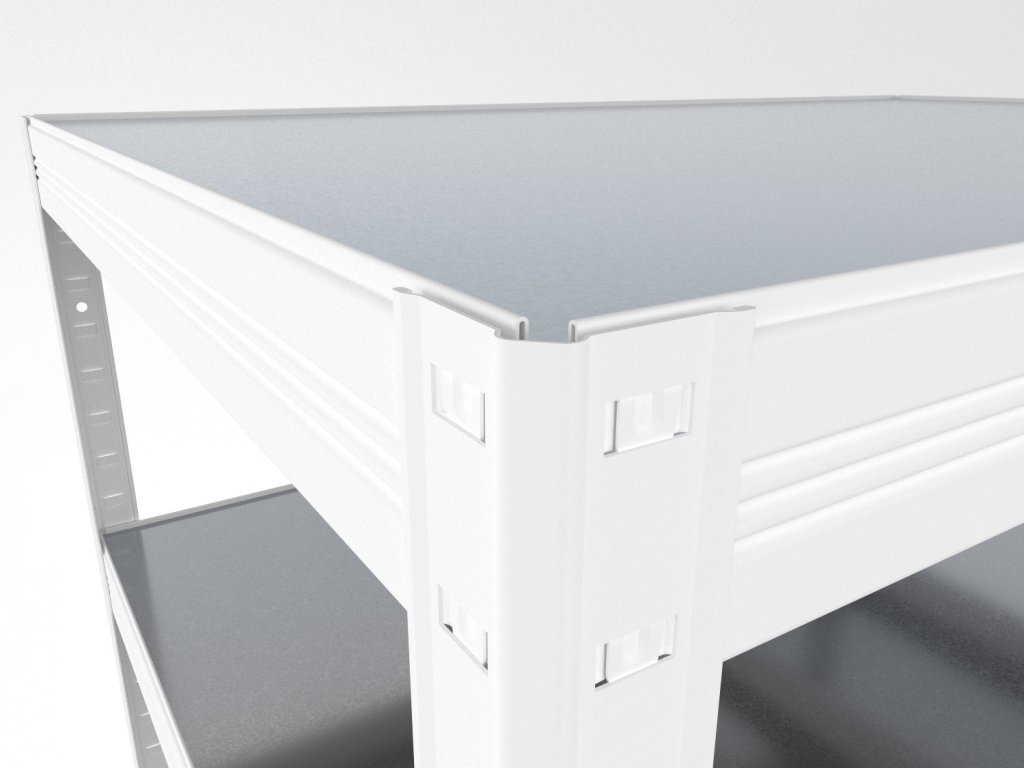 Regál do technické místnosti s pozinkovanými plechovými policemi, které jsou odolné, omyvatelné a vhodné i do vlhkého prostředí jako jsou sklepy, garáže nebo skleníky. Unikátní bezšroubový systém zaručuje rychlou montáž a vysokou stabilitu. Police jsou navíc chytře zapuštěny do nosníků, čímž vzniká praktický 4mm okraj, který brání vypadnutí uložených předmětů.