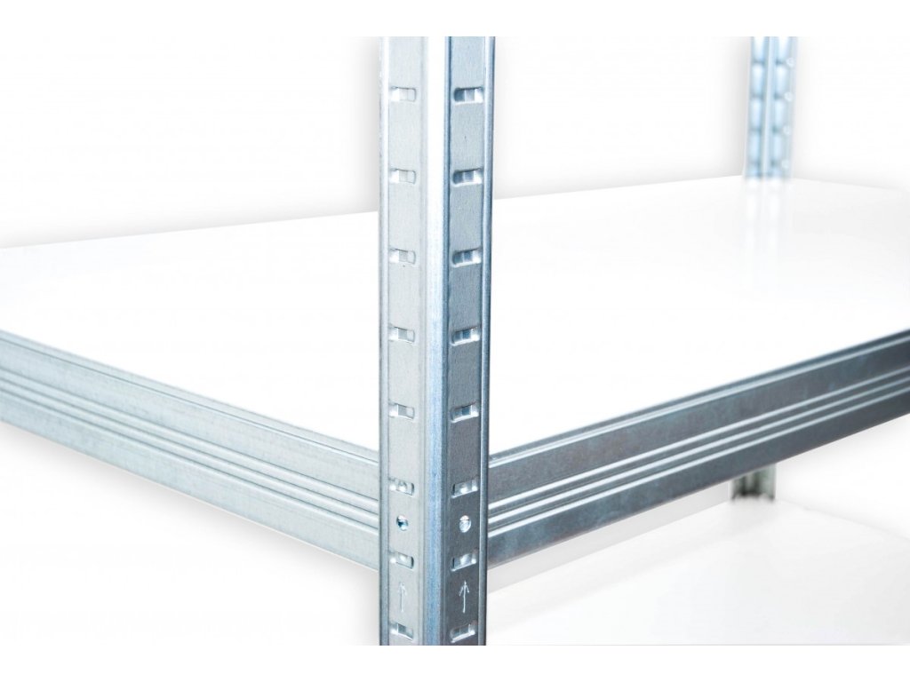 Regál s kovovou konstrukcí, police bílá laminovaná dřevotříska 12 mm, ohraněná ABS hranou ze všech stran - police regálu jsou proto odolnější proti vlhkosti. Údržbu regálu můžete provádět vlhkým hadrem, ale nezapomeňte na konci otřít police do sucha. Jednoduchá a rychlá montáž regálu - nosníky zasunete do stojinek a poklepem dorazíte na doraz. Tímto je zaručena vysoká stabilita regálu, ale i rychlost montáže - žádné šroubky! Využití regálu: suché sklepy, půdy, sklady, prodejny, dílny, servisy, archívy atd..
