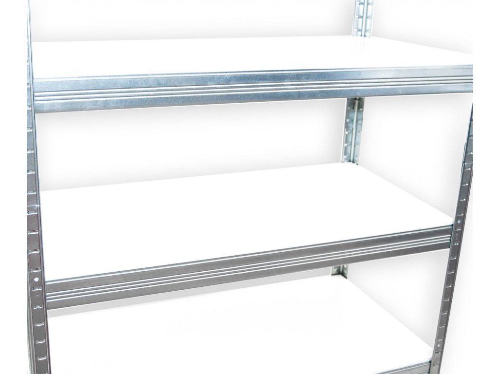 Regál s kovovou konstrukcí, police bílá laminovaná dřevotříska 12 mm, ohraněná ABS hranou ze všech stran - police regálu jsou proto odolnější proti vlhkosti. Údržbu regálu můžete provádět vlhkým hadrem, ale nezapomeňte na konci otřít police do sucha. Jednoduchá a rychlá montáž regálu - nosníky zasunete do stojinek a poklepem dorazíte na doraz. Tímto je zaručena vysoká stabilita regálu, ale i rychlost montáže - žádné šroubky! Využití regálu: suché sklepy, půdy, sklady, prodejny, dílny, servisy, archívy atd..