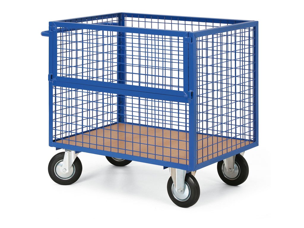 Vozík k přepravě materiálu, který může být stohován na sobě, avšak toto stohování není stabilní např. pojezdová kola, ložiska apod. Velikost plošiny je 1000 x 700 mm a celková výška 1000 mm. Nosnost vozíku je 400 kg. Pevná svařovaná konstrukce, čelní stěna sklopná. stěny jsou ze síta 50 x 50 x 4 mm . Kola jsou vybavena poklicí, která brání namotávání nití a provázků a také zanášení ložiska různými nečistotami, čímž se prodlužuje životnost kola. Kola jsou o průměru 200 mm a 2 jsou pevná a 2 otočná podle vlastní osy. Kola lze na objednávku doplnit o dvojčinnou brzdou proti pojezdu i proti otáčení kolem svislé osy. Lakováno vypalovacím práškovým lakem RAL 5005. Dno je z laminované dřevotřísky, která je vsazena do ocelového rámu.
