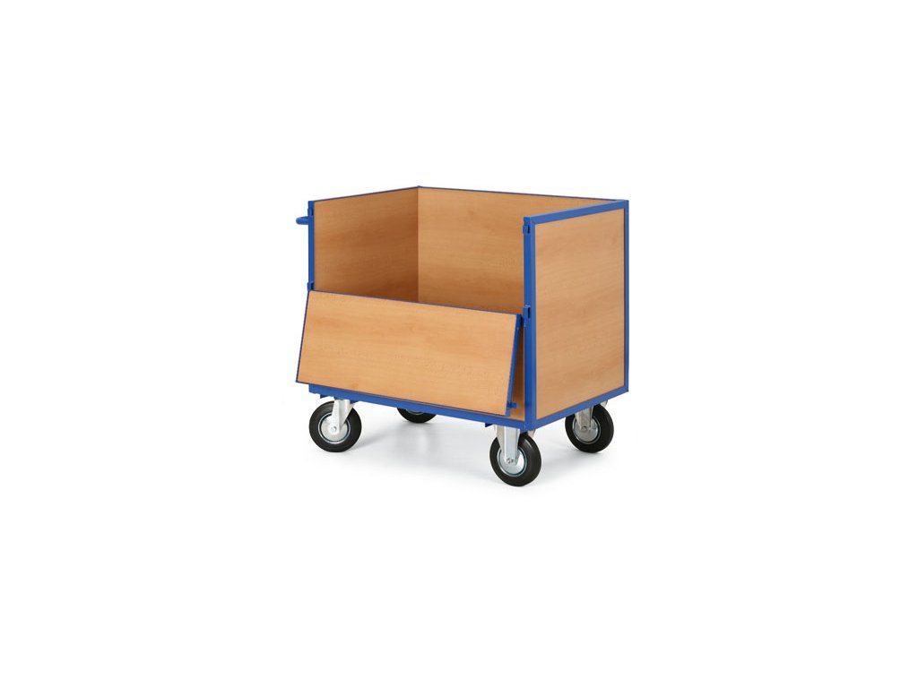Vozík k přepravě materiálu, který může být stohován na sobě, avšak toto stohování není stabilní např. pojezdová kola, ložiska apod. Velikost plošiny je 1000 x 700 mm a celková výška 1000 mm. Nosnost vozíku je 400 kg. Pevná svařovaná konstrukce, čelní stěna sklopná. Kola jsou vybavena poklicí, která brání namotávání nití a provázků a také zanášení ložiska různými nečistotami, čímž se prodlužuje životnost kola. Kola jsou o průměru 200 mm a 2 jsou pevná a 2 otočná podle vlastní osy. Kola lze na objednávku doplnit o dvojčinnou brzdou proti pojezdu i proti otáčení kolem svislé osy. Lakováno vypalovacím práškovým lakem RAL 5005. Dno je z laminované dřevotřísky, která je vsazena do ocelového rámu.