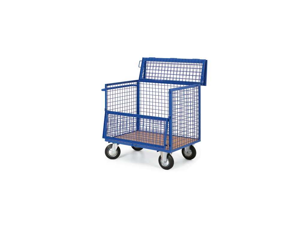 Vozík k přepravě materiálu, který může být stohován na sobě, avšak toto stohování není stabilní např. pojezdová kola, ložiska apod. Velikost plošiny je 1000 x 700 mm a celková výška 1000 mm. Nosnost vozíku je 400 kg. Pevná svařovaná konstrukce, čelní stěna sklopná. Horní víko je na otočných čepech a je vybaveno oky pro uzamknutí visacím zámkem. Visací zámek není součástí dodávky. Stěny a horní víko je ze síta 50 x 50 x 4 mm. Kola jsou vybavena poklicí, která brání namotávání nití a provázků a také zanášení ložiska různými nečistotami, čímž se prodlužuje životnost kola. Kola jsou o průměru 200 mm a 2 jsou pevná a 2 otočná podle vlastní osy. Kola lze na objednávku doplnit o dvojčinnou brzdou proti pojezdu i proti otáčení kolem svislé osy. Lakováno vypalovacím práškovým lakem RAL 5005. Dno je z laminované dřevotřísky, která je vsazena do ocelového rámu