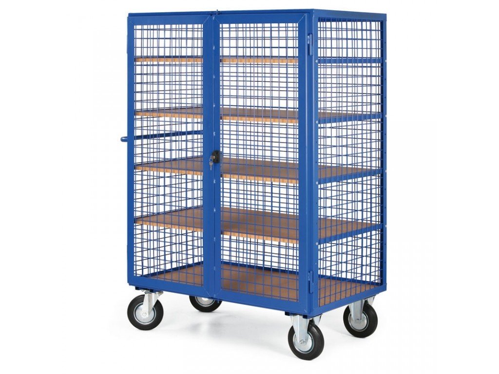 Vozík k přepravě a uskladnění materiálu, které potřebujete chránit před odcizením. Velikost plošiny je 1200 x 800 mm a celková výška 1000 mm. Nosnost vozíku je 600 kg. Pevná svařovaná konstrukce vozíku z ocelových profilů, stěny a horní víko ze síta o průměru 50 x 50 mm. Vozík je vybaven dvojitými křídlovými dveřmi s cylindrickým zámkem. Součástí dodávky jsou 2 klíče. Kola jsou vybavena poklicí, která brání namotávání nití a provázků a také zanášení ložiska různými nečistotami, čímž se prodlužuje životnost kola. Kola jsou o průměru 200 mm a 2 jsou pevná a 2 otočná podle vlastní osy. Kola lze na objednávku doplnit o dvojčinnou brzdou proti pojezdu i proti otáčení kolem svislé osy. Lakováno vypalovacím práškovým lakem RAL 5005. Dno je z laminované dřevotřísky, která je vsazena do ocelového rámu.