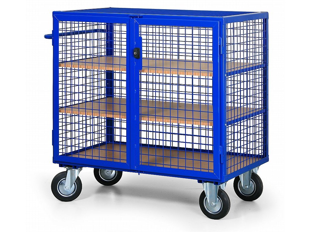 Vozík k přepravě a uskladnění materiálu, které potřebujete chránit před odcizením. Velikost plošiny je 1200 x 800 mm a celková výška 1250 mm. Nosnost vozíku je 600 kg. Pevná svařovaná konstrukce vozíku z ocelových profilů, stěny a horní víko jsou z pletiva, oka 50 x 50 mm. Vozík je vybaven dvojitými křídlovými dveřmi s cylindrickým zámkem. Součástí dodávky jsou 2 klíče. Kola jsou vybavena poklicí, která brání namotávání nití a provázků a také zanášení ložiska různými nečistotami, čímž se prodlužuje životnost kola. Kola jsou o průměru 200 mm a 2 jsou pevná a 2 otočná podle vlastní osy. Kola lze na objednávku doplnit o dvojčinnou brzdou proti pojezdu i proti otáčení kolem svislé osy. Lakováno vypalovacím práškovým lakem RAL 5005. Dno je z laminované dřevotřísky, která je vsazena do ocelového rámu. 2 police z laminované dřevotřísky jsou přestavitelné po 10 cm.