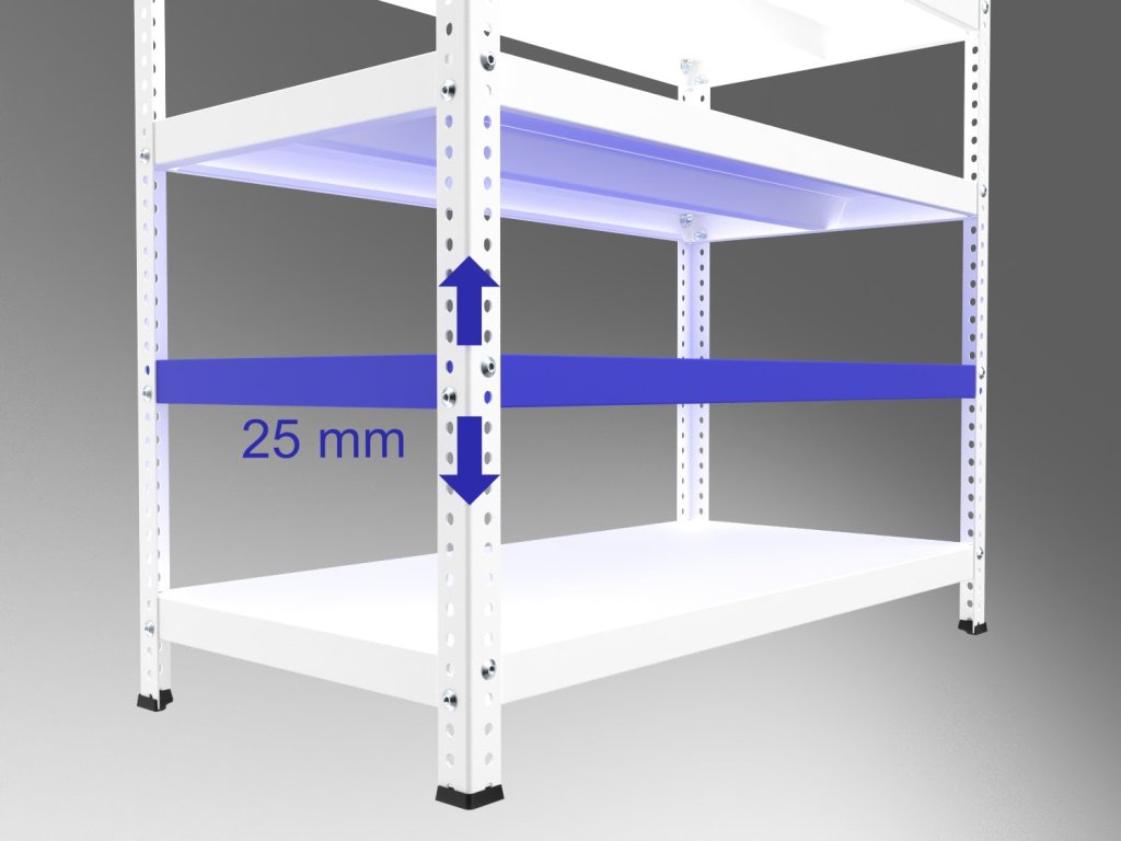 - Regály o výšce 180 cm a vyšší doporučujeme kotvit k pevnému podkladu (např. ke stěně) minimálně ve dvou místech (1x v každé stojině) v horní části regálu vhodným kotvícím materiálem. Kotvící materiál není součástí balení.